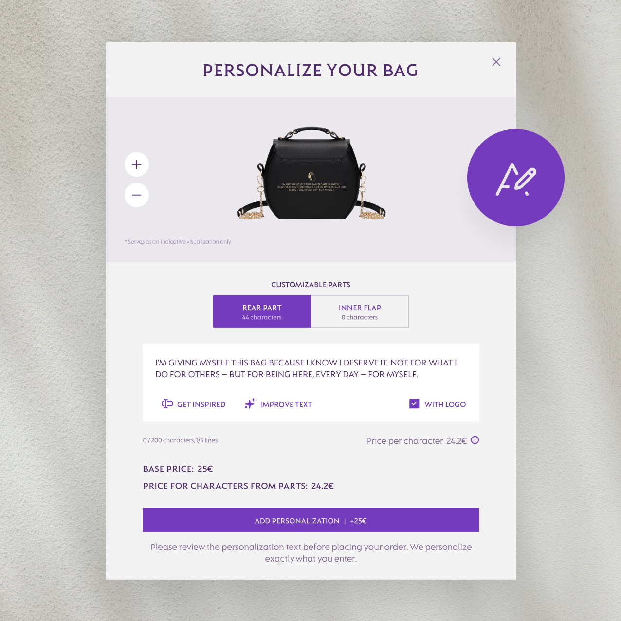 Choose where you want to place your message – on the inside flap or the back of the product. Enter your own text (in any language) or choose from our inspirations. Don't know what to write? Let us generate the text for you. The color of the text on the handbag adapts to the color of the hardware, but for some models the color is fixed to black.